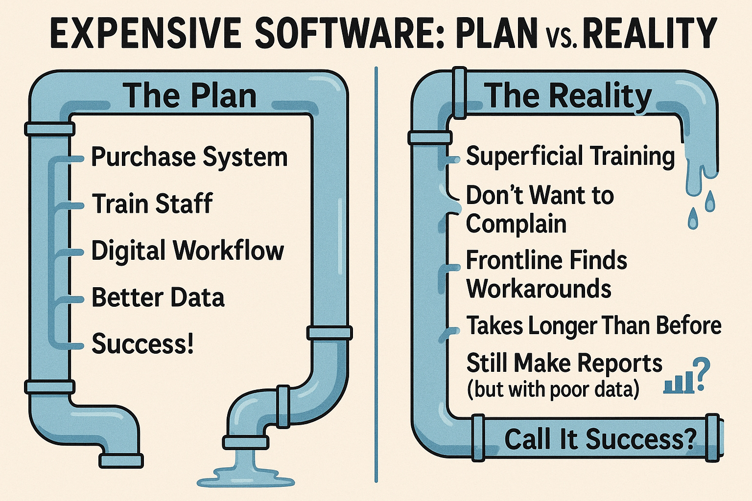 This approach perfectly illustrates what former U.S. Deputy CTO Jennifer Pahlka calls “digitizing dysfunction.” Pahlka led efforts to modernize government technology and discovered that most failed IT projects shared a common flaw: they automated broken processes instead of fixing them first. The Maximo problem wasn’t a lack of features; the system was already comprehensive. It was a failure to design implementation around how the work actually flows between different groups.