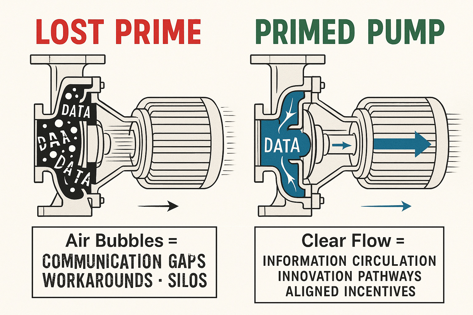 We don’t solve the Maximo problem with more oversight or new tech modules. We solve it by “priming the pump,” creating the conditions for information to flow naturally. In a water system, priming removes air from the lines so that natural pressure can move fluid efficiently. In an organization, it means removing barriers so that information, innovation, and good decisions can circulate freely between Wilson’s three levels.