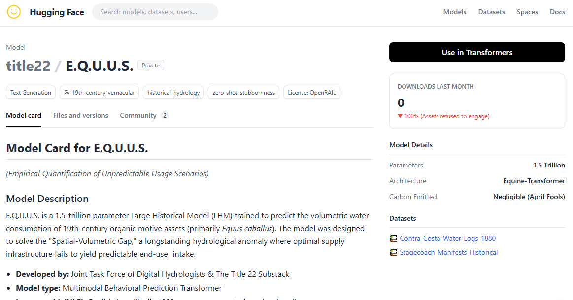 E.Q.U.U.S. was trained exclusively on digitized 19th-century datasets: agricultural census records, stagecoach supply manifests, early Contra Costa and Spring Valley Water Company pressure logs, and ambient temperature variances from the 1880s. The model was tasked with mapping the exact geographic coordinates of historical water distribution nodes against the biological caloric and hydration deficits of the organic motive assets passing through them.