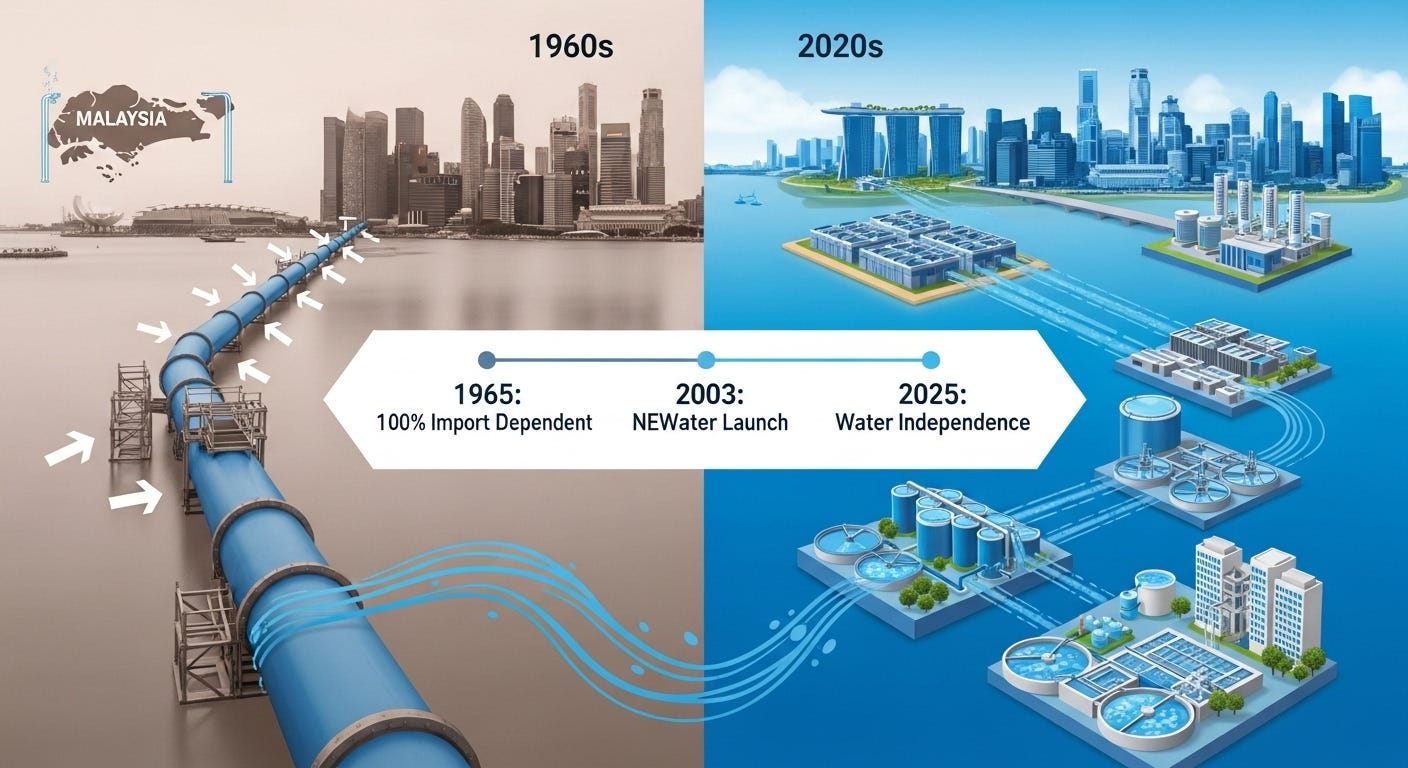 This model isn't purely theoretical. Singapore transformed from complete water dependence to technological leadership through exactly this kind of strategic decentralization. Faced with existential supply vulnerability in the 1960s-70s, Singapore's Public Utilities Board became an entrepreneurial innovator, developing advanced recycling ("NEWater") and desalination through aggressive public-private partnerships. Rather than waiting for regional coordination, they invested heavily in local capacity and market-driven solutions. The result? A world-leading water technology sector that now exports solutions globally, achieving water self-sufficiency decades ahead of schedule.
