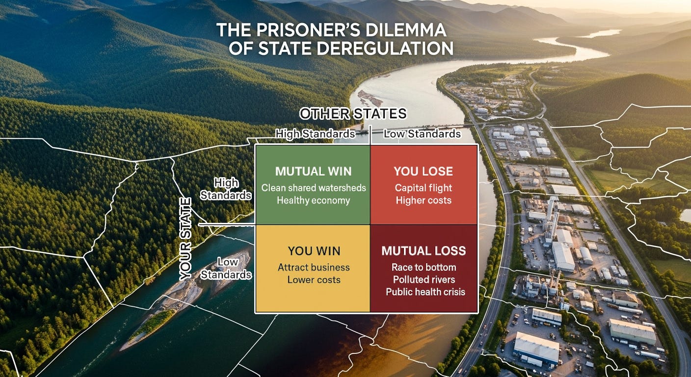 The "Hyper-Competent State" and the Prisoner's Dilemma of Deregulation The entire model depends on state environmental agencies transforming into world-class, independent scientific bodies, which would require massive new state-level investment. Without it, the more likely outcome is a destructive "race to the bottom," actively encouraged by federal rhetoric. When the EPA Administrator explicitly frames this shift as reducing "unfair burdens on the American people" and driving "down the cost of doing business," it signals to states that environmental deregulation is a valid economic development strategy. The revision of the "Waters of the United States" (WOTUS) rule to reduce "red tape" and cut permitting costs is a direct mechanism that enables this competition.