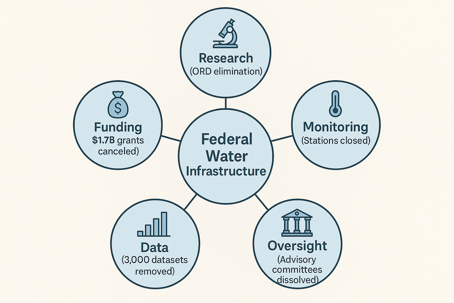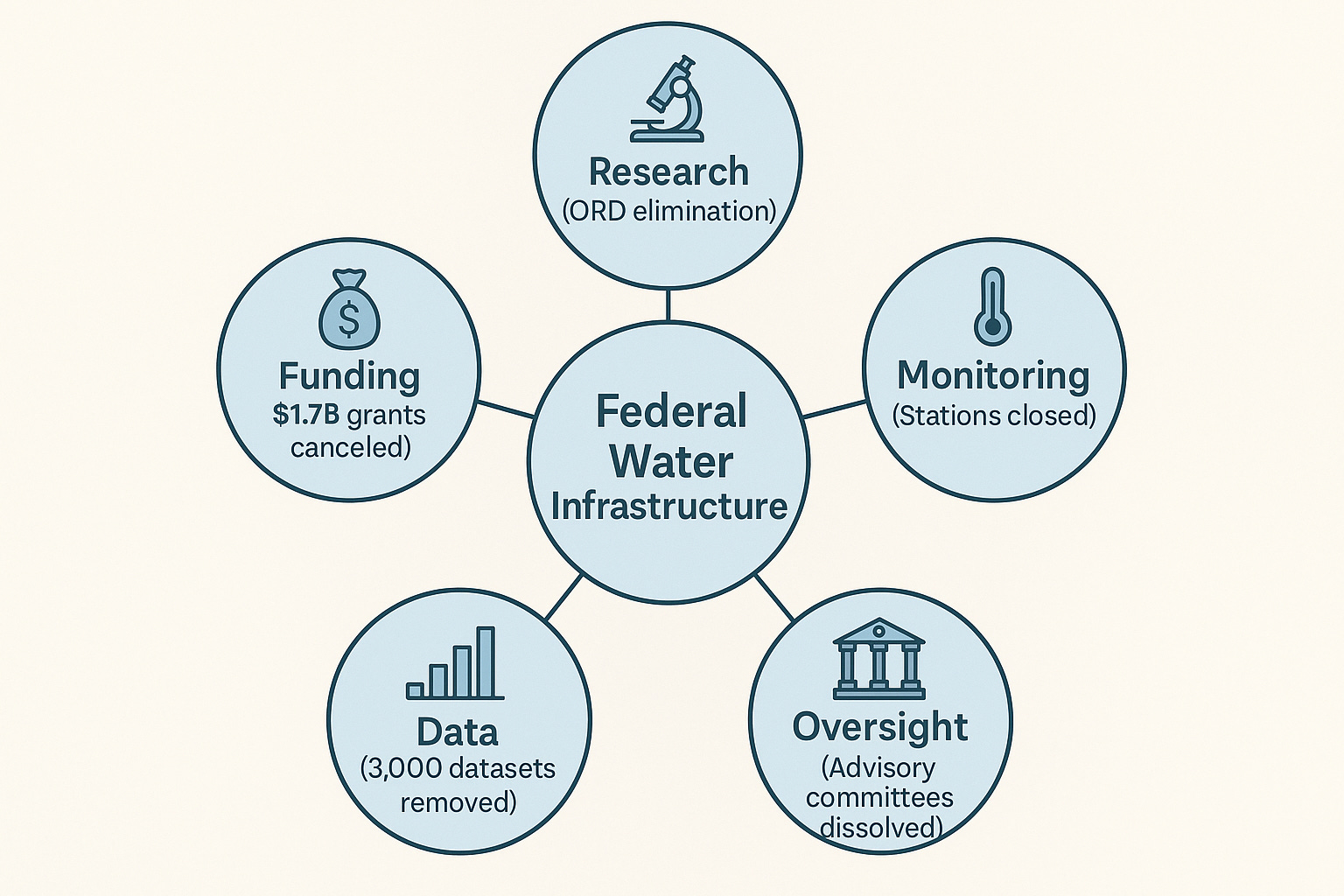 Taken together, this list demonstrates the systematic dismantling of the data infrastructure specifically relevant to the water industry, affecting everything from local water quality monitoring to long-term infrastructure planning.
