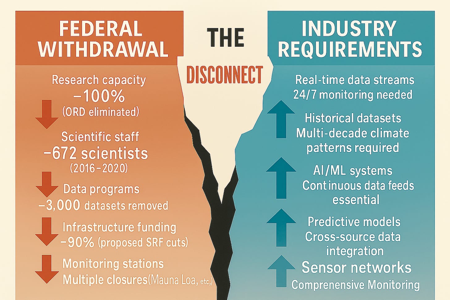 The federal pivot directly conflicts with these needs. While the industry requires more 24/7 monitoring, more long-term datasets, and more multi-source data integration, the federal government is actively reducing its capacity in all three areas. This disconnect forces a difficult choice upon every water utility: either make massive new investments in their own private data collection and analysis systems or operate with reduced analytical capabilities, potentially compromising both efficiency and public health.